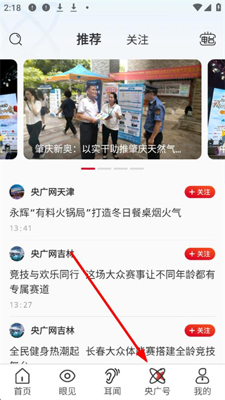 4、點擊底部央廣號按鈕,進入央廣號界面,展示推薦、關注板塊,可瀏覽央廣網各地賬號發布的資訊,還能關注感興趣的賬號。