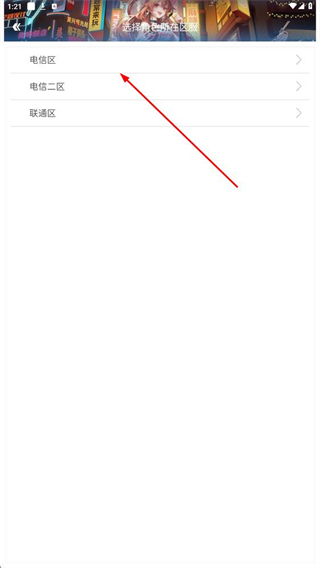 4、區服選擇頁面,可選擇電信區、電信二區等區服,選擇后進入對應游戲區域,管理游戲角色。