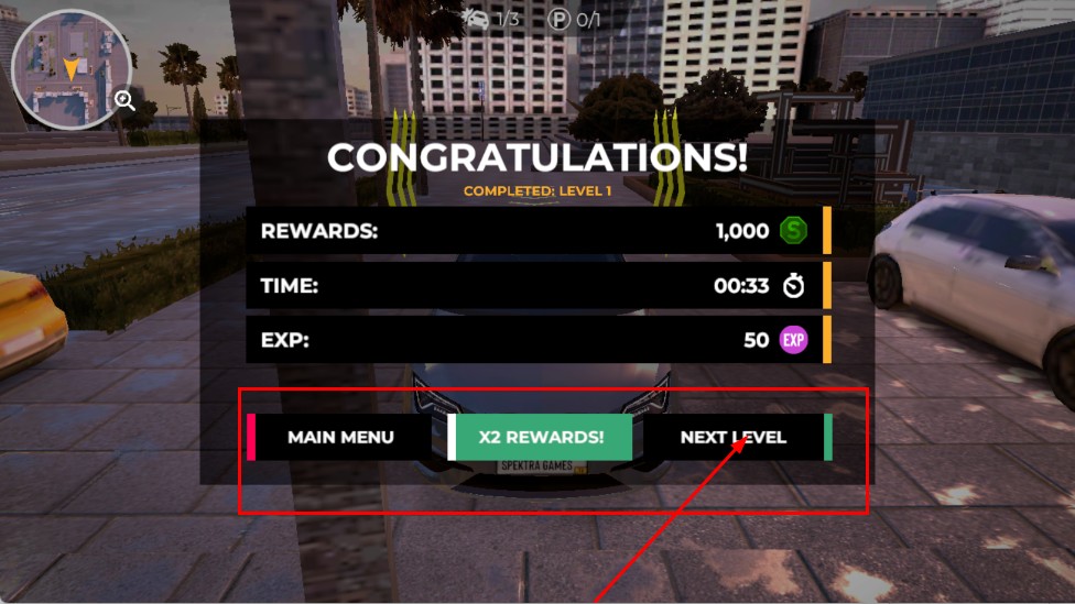 4、完成當前關卡后,在結算界面點擊NEXT LEVEL按鈕,可進入下一個關卡,繼續汽車駕駛與停車的挑戰。