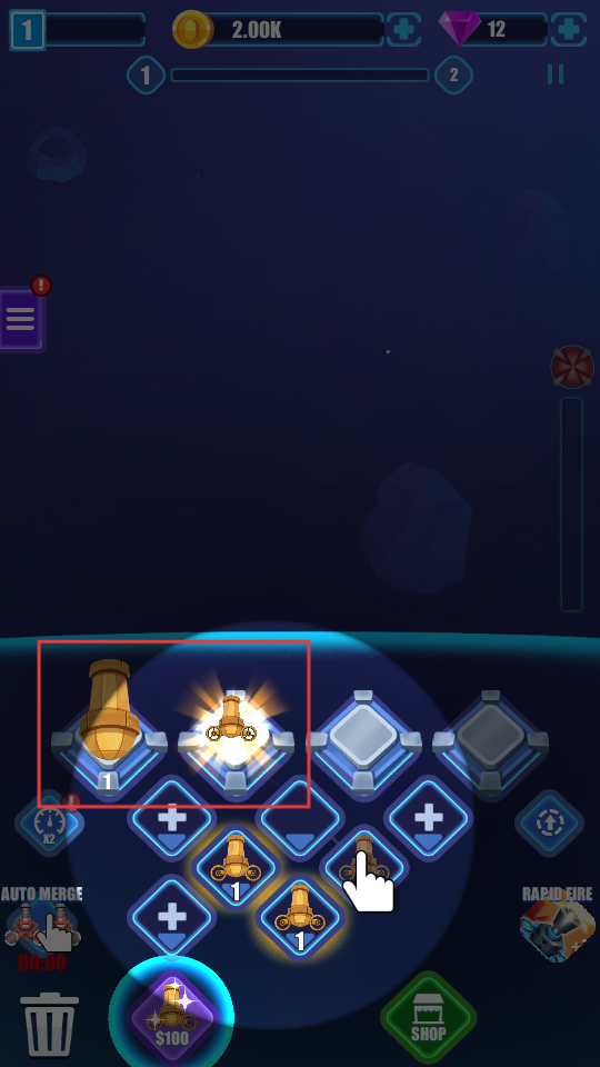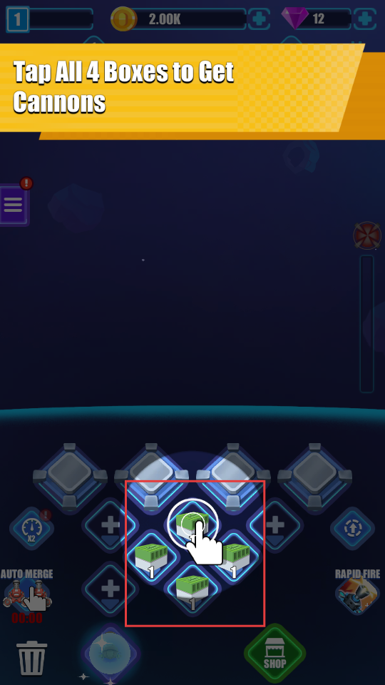 1、點擊四個盒子,通過操作獲取加農炮,這些加農炮是后續防御和攻擊的重要武器,為戰斗做好準備。