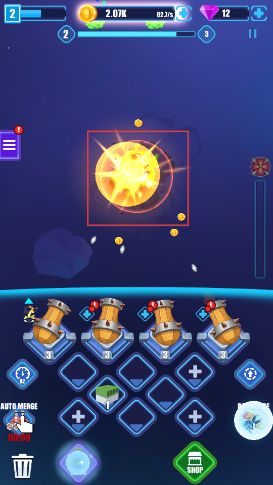 3、加農炮會自動攻擊來襲的目標,成功擊中目標會產生爆炸效果,還能獲得金幣等獎勵,助力后續升級。