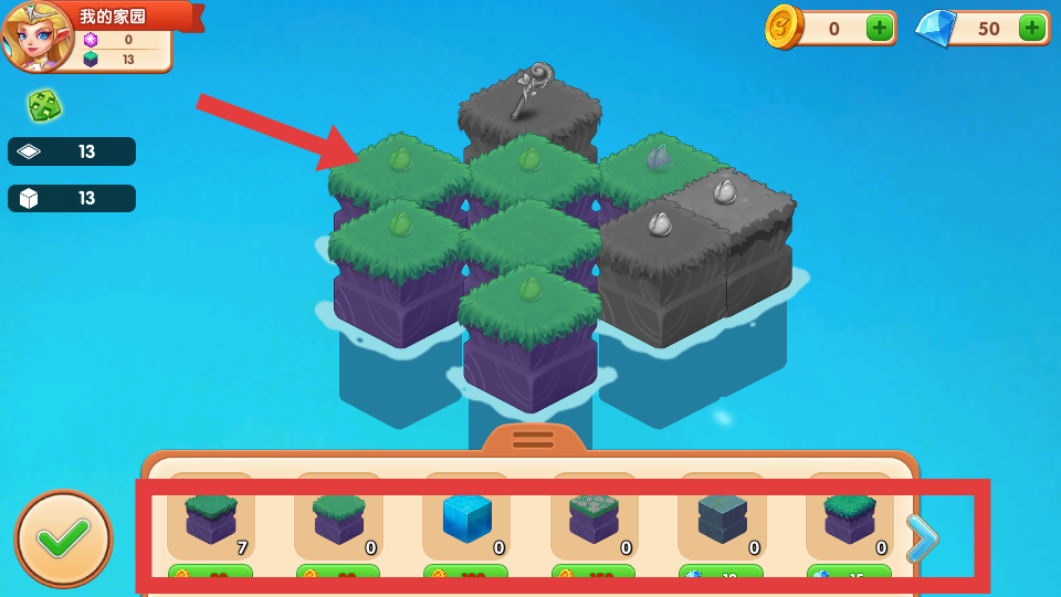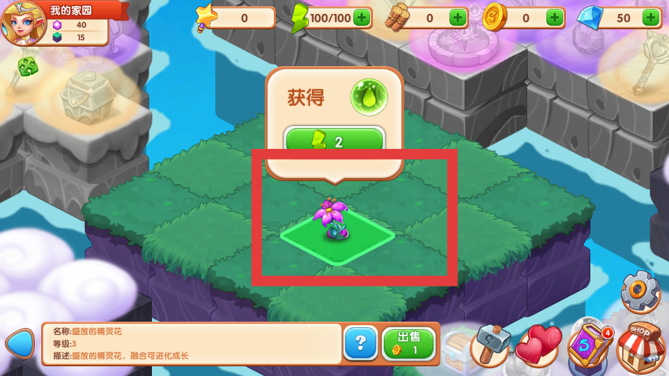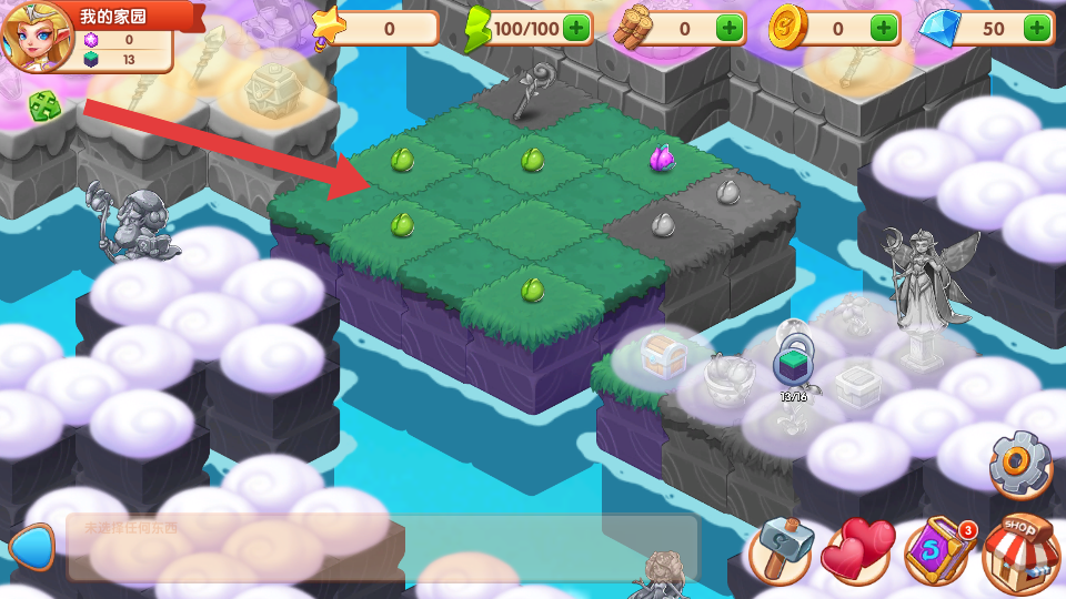 2、通過合成等操作,逐步拓展家園的土地面積,解鎖更多可操作的空間,用于放置和合成元素。