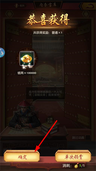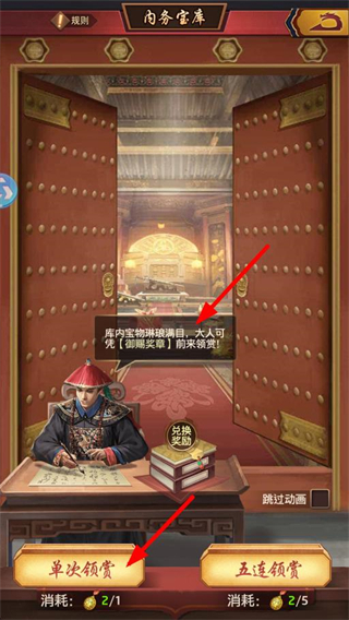 3、進入內務客庫界面,可選擇單次領賞或五連領賞,消耗對應數量的道具,即可獲取庫內的賞賜物品。