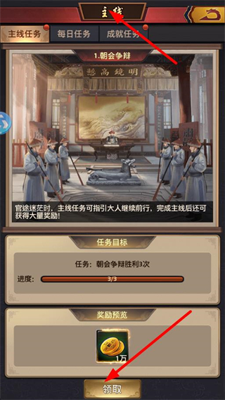 2、在主線任務界面,可查看朝堂爭辯相關任務,完成任務進度后,點擊領取按鈕,即可獲得對應的金幣獎勵。