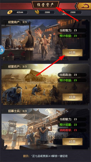 1、經營資產界面,可對商鋪、農產、士兵分別進行經營操作,每次經營會對應提升智力、農政、魅力,同時獲得收益。