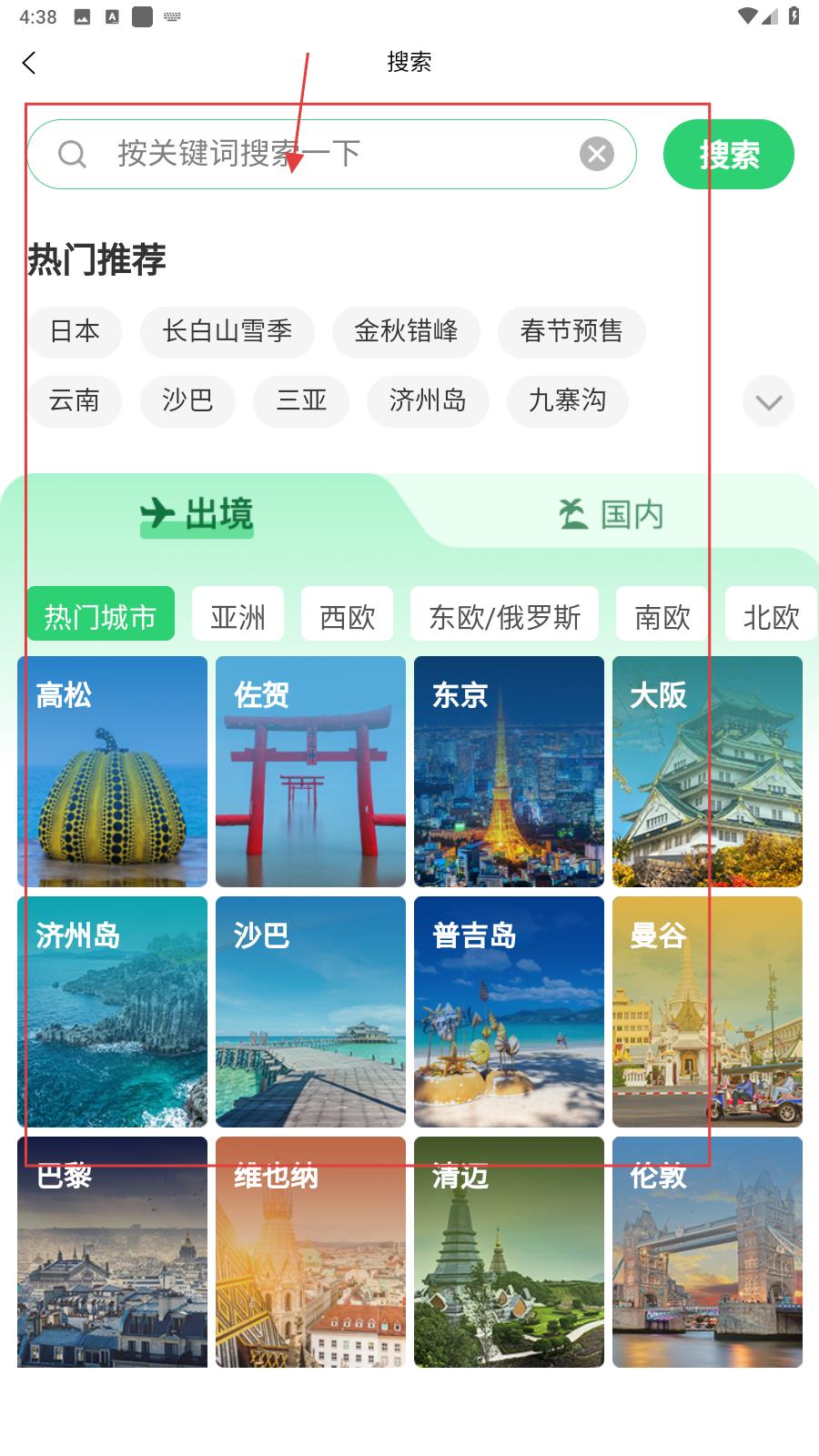 1、進入搜索界面,可按關鍵詞搜旅游產品,有日本、長白山雪季等熱門推薦,出境游涵蓋高松、東京等多地,助力快速找到心儀旅游目的地。
