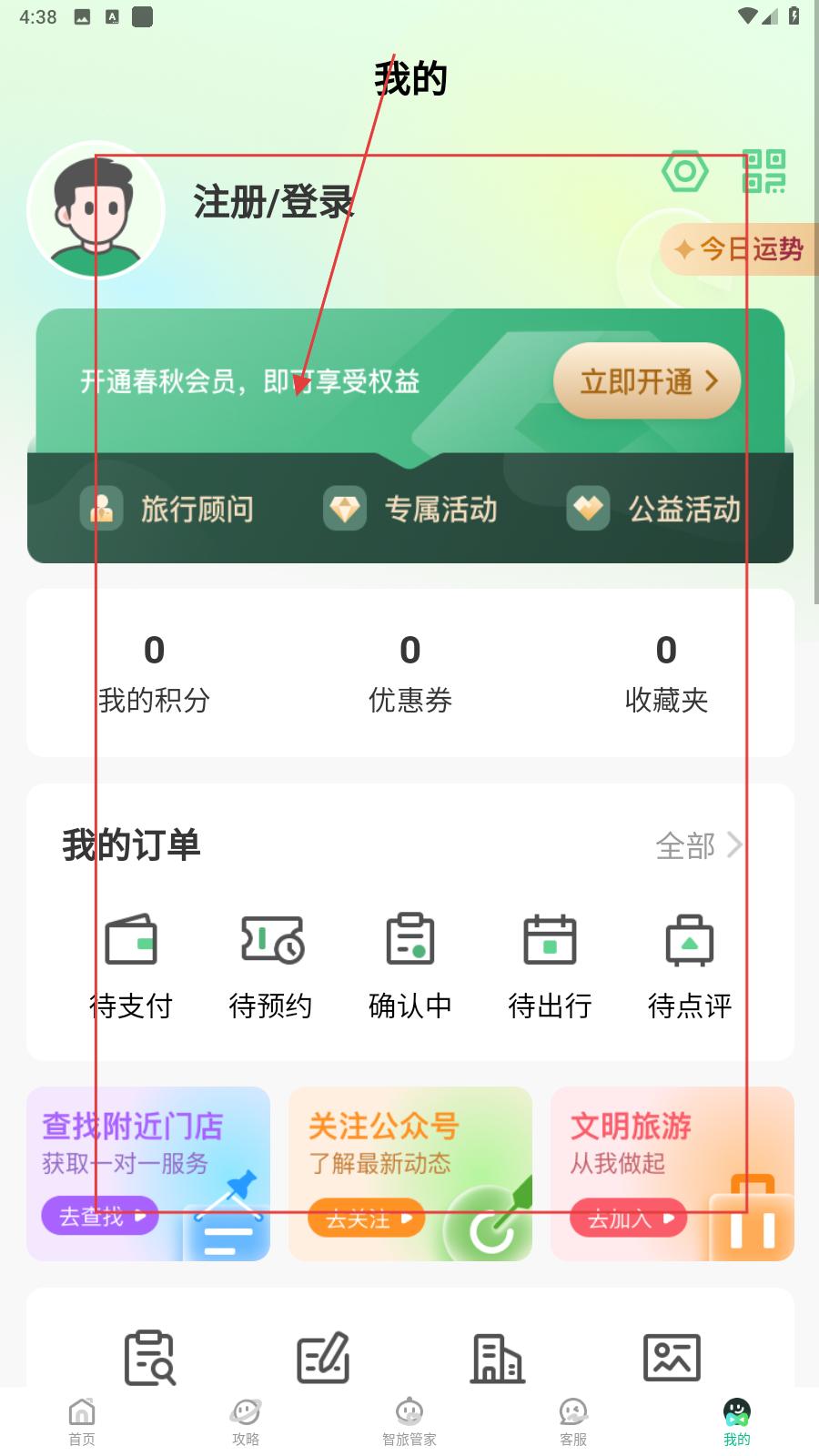2、用戶可在我的界面,可注冊登錄,開通春秋會員享權益,管理積分、優惠券、收藏夾,還能查看訂單狀態,方便一站式管理旅游信息。