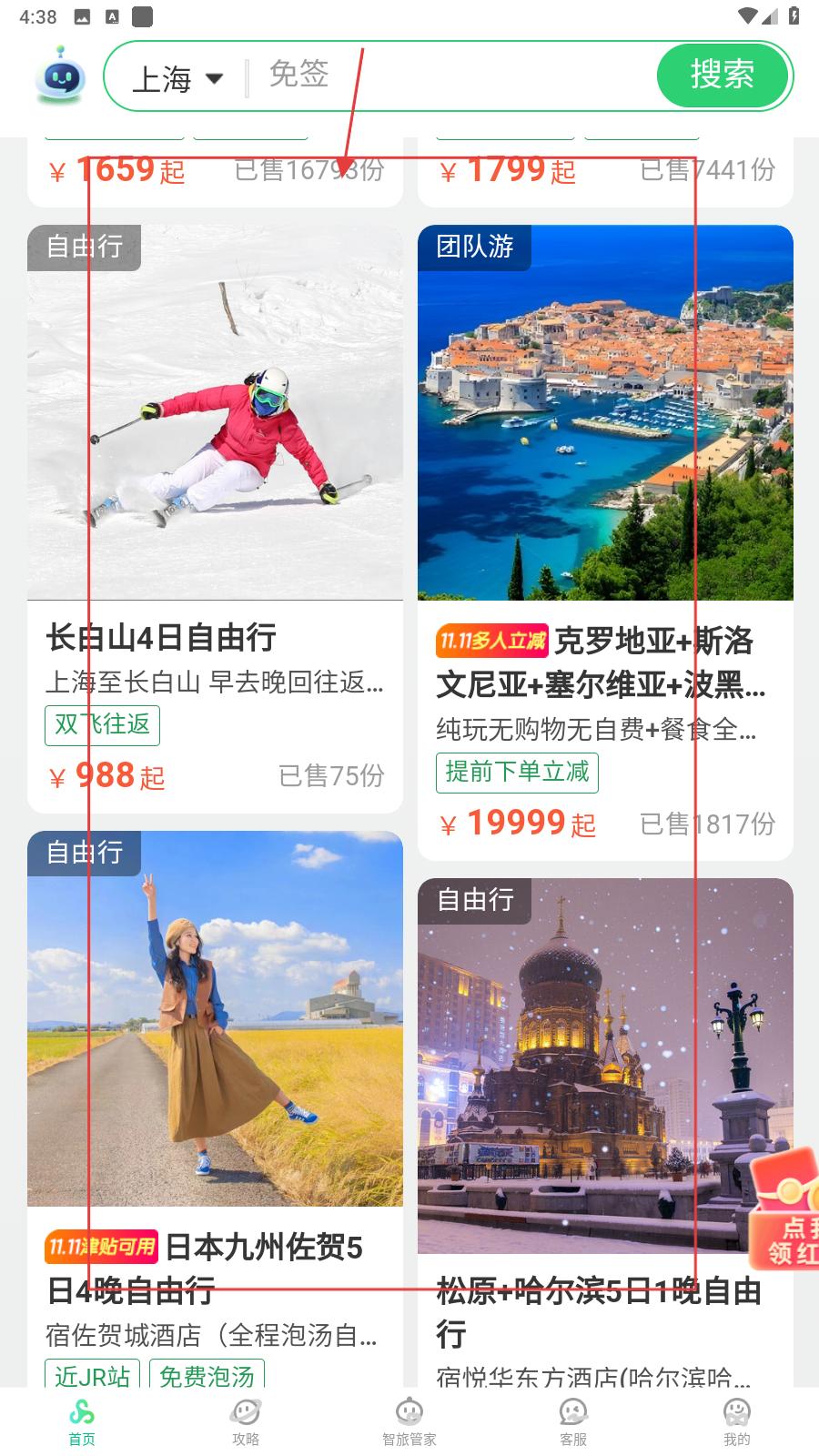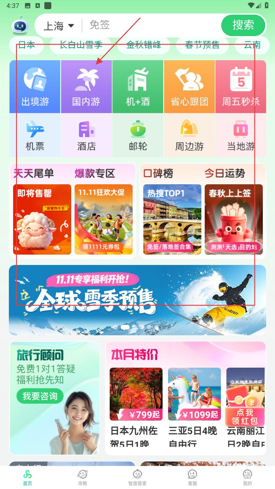 3、在首頁有出境游、國內游等功能入口,還有天天尾單、爆款專區等活動,可參與全球雪季預售,助力用戶便捷選購旅游產品,享受優惠活動。