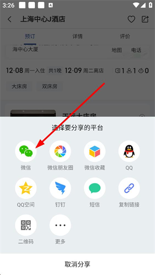4、操作中點擊分享按鈕,會彈出平臺選擇界面,含微信等多種分享渠道,選擇對應的平臺,即可完成該酒店相關信息的分享操作。