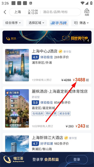 2、點擊訂酒店后進入酒店列表頁,可查看不同酒店的評分、價格及位置信息,選擇目標酒店,即可進入該酒店的詳情頁面,繼續后續操作。
