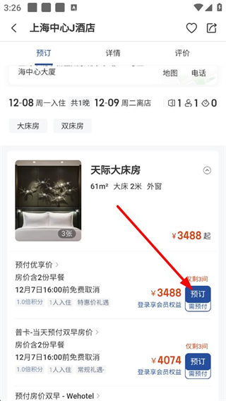3、進入酒店詳情頁,選定入住離店時間及房型,查看對應房型的價格與權益,點擊預訂按鈕可發起預訂,也能查看酒店詳情或用戶評價。