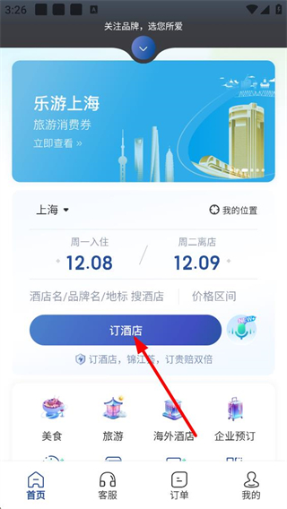 1、進入錦江薈首頁,可看到樂游上海活動入口,選定所在城市及入住離店日期,點擊訂酒店按鈕,即可進入酒店列表頁面,同時能使用美食等功能。
