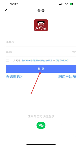 1、登錄頁,支持手機號密碼、微信快捷登錄,需勾選協議,是使用志愿填報等功能的前提,保障高考志愿規劃服務。