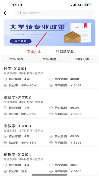 3、專業查詢板塊,按層次類型分類展示專業,標注修業年限等信息,幫助考生了解專業情況,輔助志愿選擇決策。