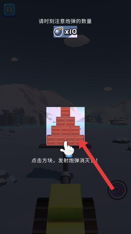 1、游戲界面提示請時刻注意炮彈的數量,有10的炮彈標識,下方有紅色方塊,按照提示點擊方塊,發射炮彈去消滅目標。