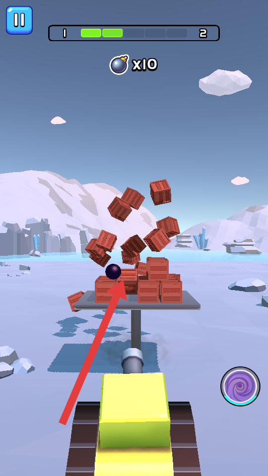 2、發射炮彈后,炮彈命中紅色方塊堆,方塊開始破碎,此時要關注炮彈剩余數量10,繼續利用炮彈清除剩余的紅色方塊。