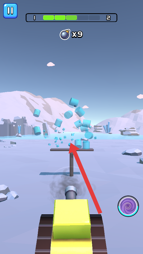 3、隨著炮彈不斷發射,藍色圓柱狀物體出現并破碎,炮彈數量變為9,需持續發射炮彈,直至清除所有目標物體。