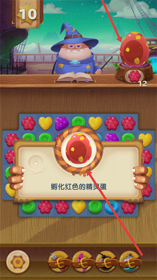 1、需孵化紅色的精靈蛋,通過消除糖果來推進孵化進程,界面顯示關卡和目標進度。