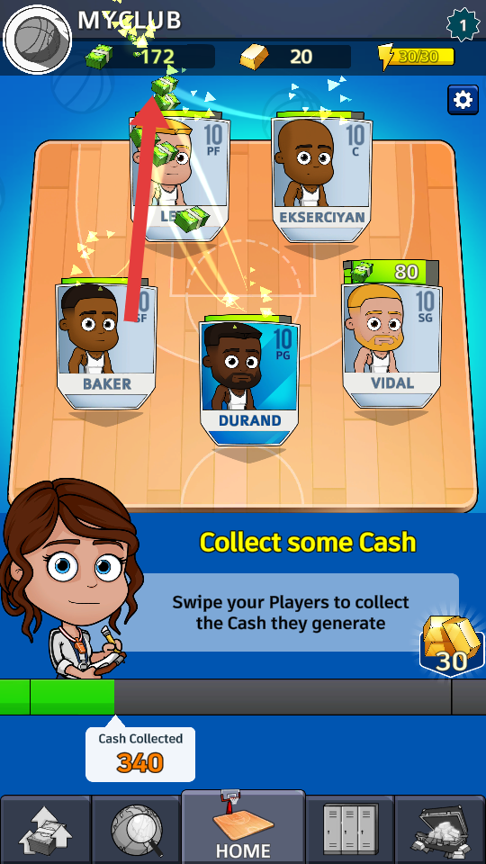 4、按照Collect some Cash的提示,通過滑動屏幕的方式,收集球員產生的現金,這些現金可以用來升級球員。