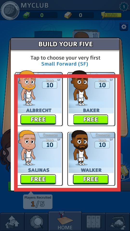 2、進入游戲主界面后,點擊球員空位,從可選球員中挑選并招募球員,組建自己的首發五虎陣容。