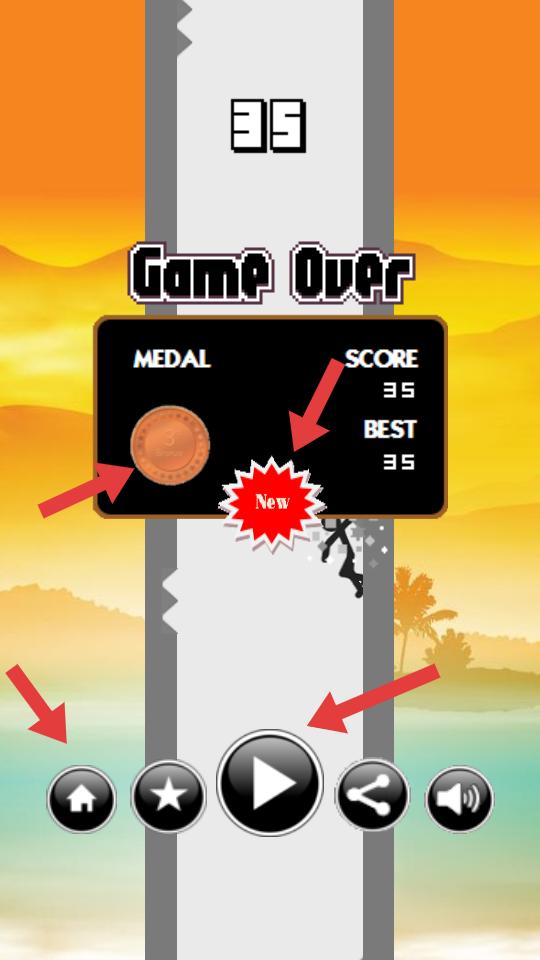 3、若游戲失敗,會出現Game Over界面,顯示得分,最佳成績等,可點擊播放按鈕重新開始。
