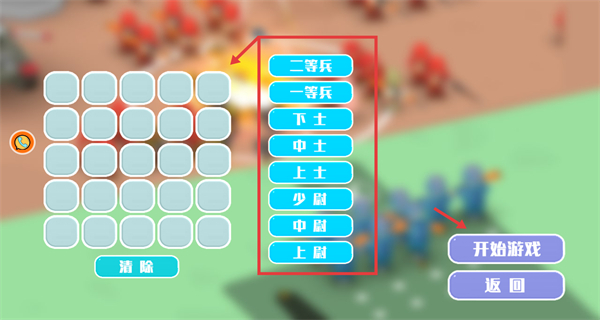 2、在士兵選擇界面從二等兵,一等兵等不同軍銜中挑選士兵組成隊伍后,點擊開始游戲進入戰斗。