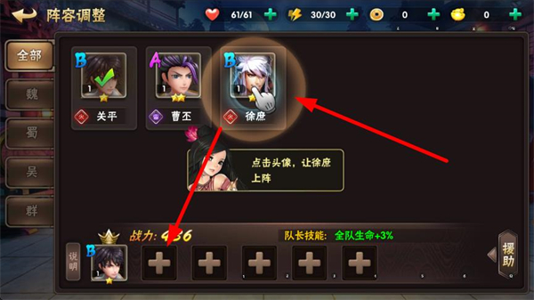 4、在陣容調整界面,點擊徐庶頭像可讓其上陣,調整陣容搭配,提升全隊戰力,還能查看隊長技能等信息。