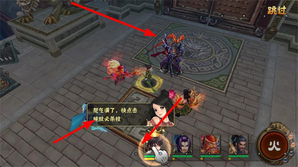 1、怒氣滿了點擊武將頭像釋放必殺技,可對敵人造成大量傷害,助力擊敗敵人,推進戰斗進程。