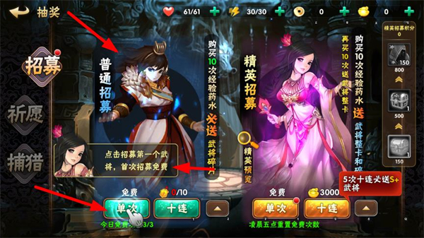 2、在招募界面可進行普通招募,首次招募免費,也可選擇單次或十連招募,還能進行精英招募,獲取武將和武將碎片。