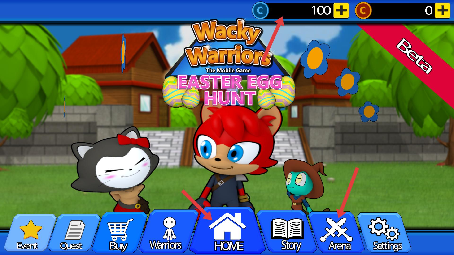 1、進入主界面,熟悉下方列表的功能,點擊HOME返回主頁,點擊Arena可對戰,優先了解各按鈕作用,參與復活節彩蛋活動,開啟游戲冒險。