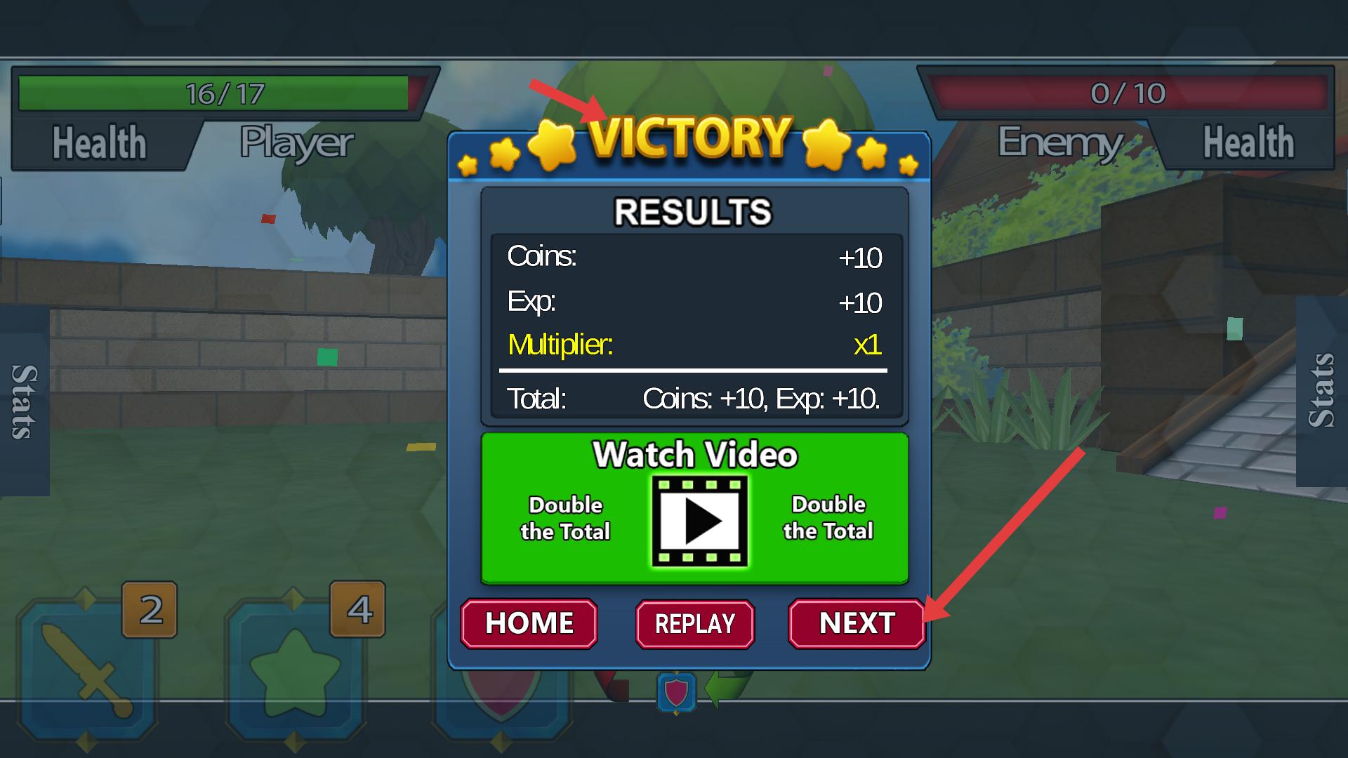 4、戰斗勝利后,獲金幣、經驗獎勵,可選擇翻倍獎勵,選NEXT繼續下一關,HOME回主頁,REPLAY重玩,合理選擇,快速推進關卡,積累資源強化角色。