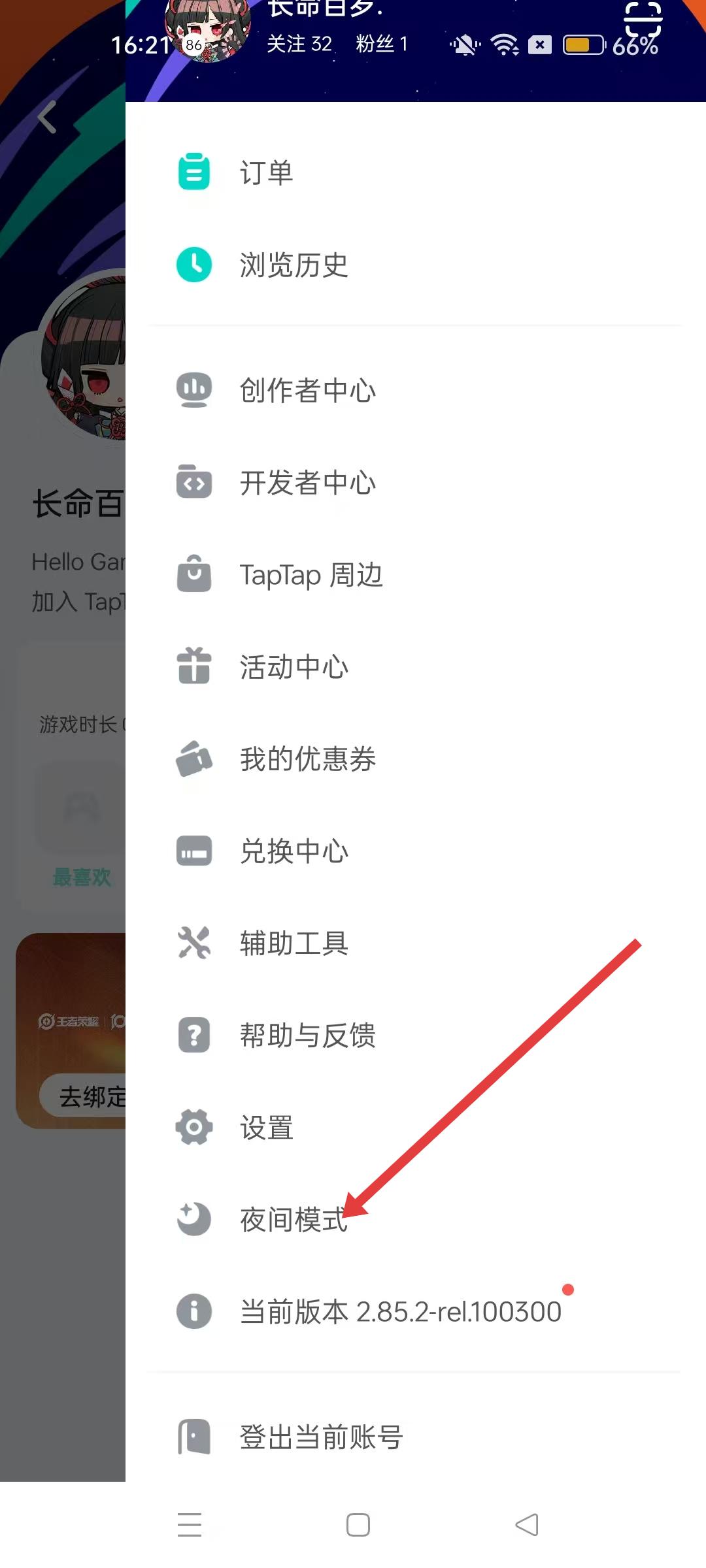 3、個人主頁界面點擊菜單,進入功能列表,找到夜間模式選項,可根據需求開啟或關閉夜間模式。