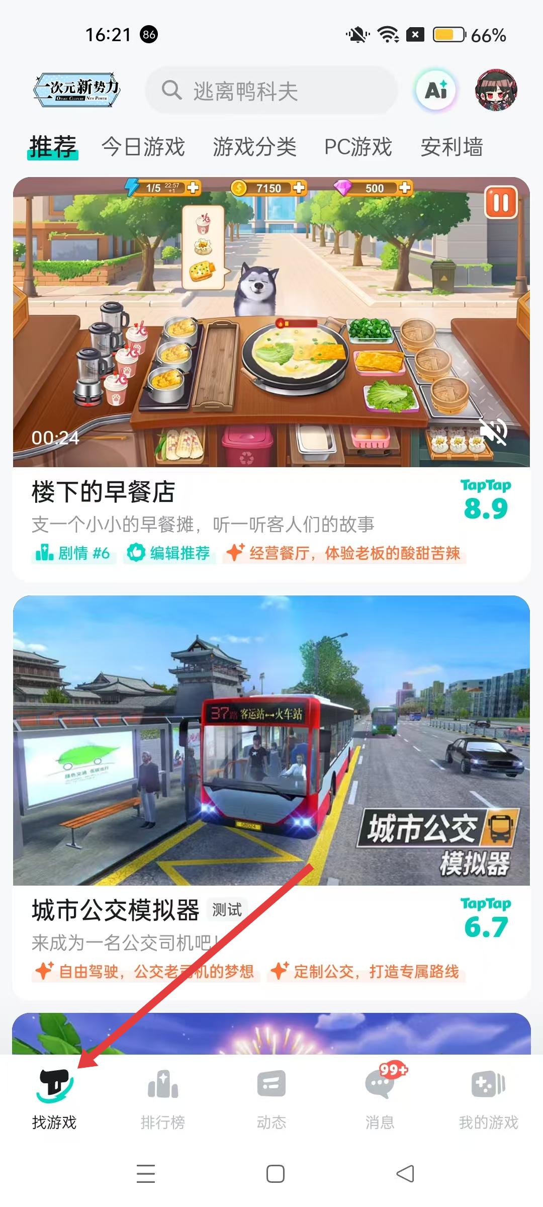 1、打開TapTap應用,進入找游戲界面,可瀏覽樓下的早餐店、城市公交模擬器等推薦游戲,開啟游戲探索。