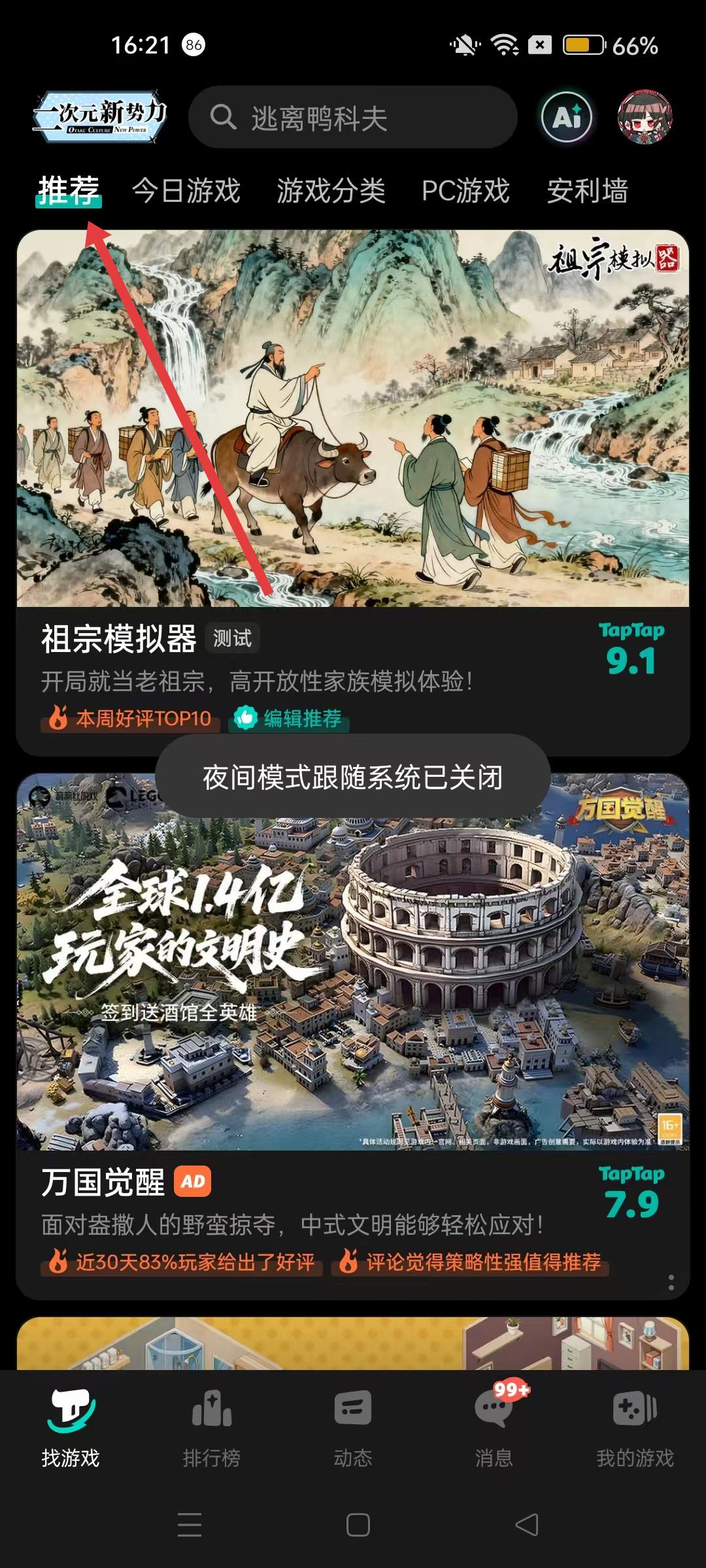 4、開啟夜間模式后,TapTap界面會切換為深色主題,如推薦的祖宗模擬器、萬國覺醒等游戲展示界面會以深色背景呈現,提升夜間使用舒適度。