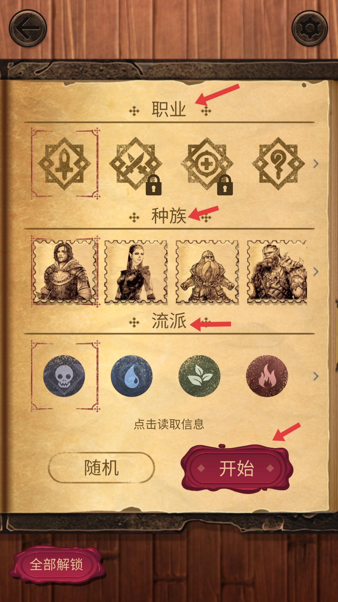 1、創建角色時,選職業、種族、流派,可搭配組合,若想隨機體驗點隨機,確定后點開始,不同組合影響玩法,優先選解鎖的,開啟冒險。