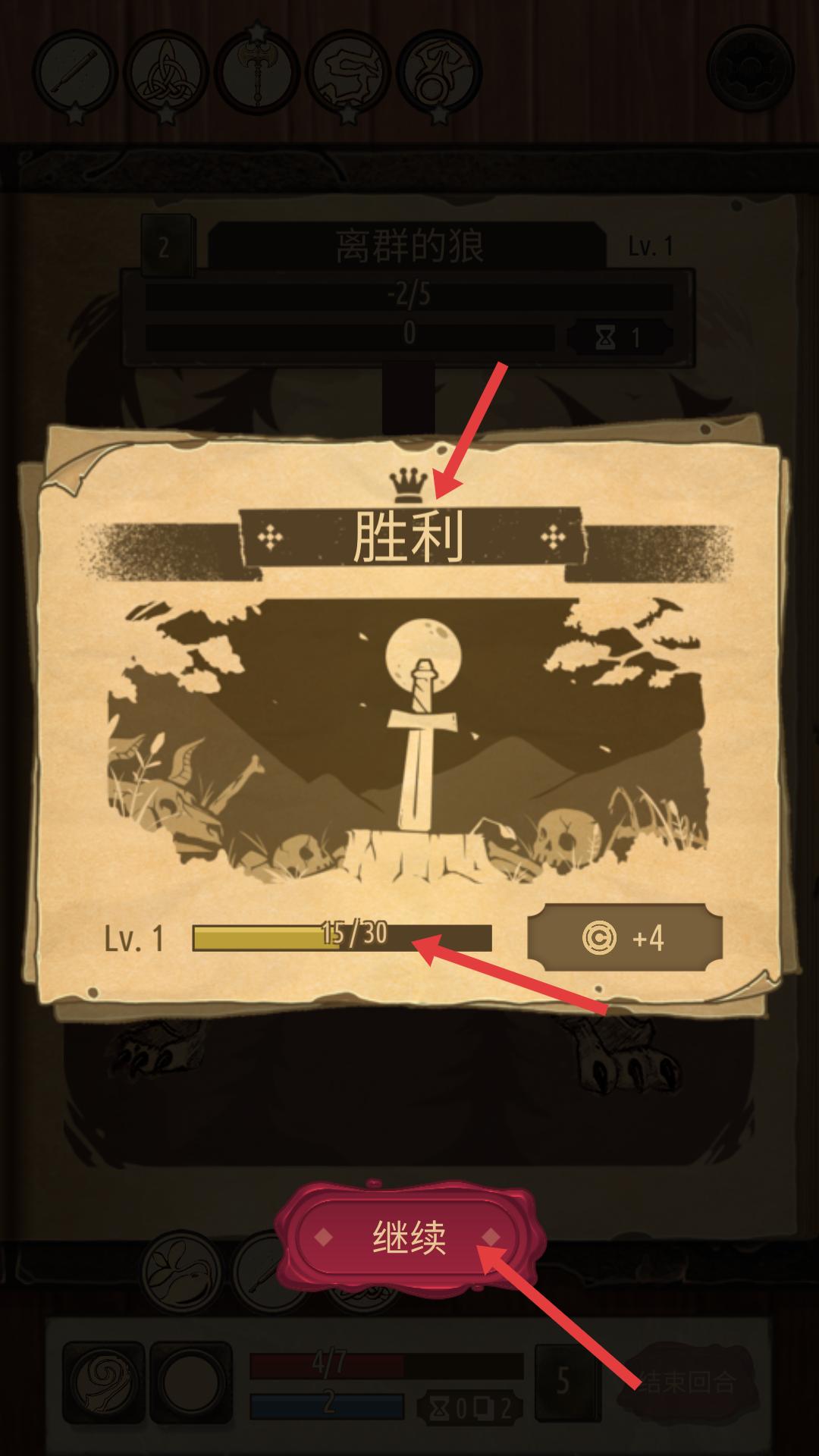 4、戰勝敵人后,顯示勝利界面,獲少量經驗、少量金幣,點繼續推進劇情,積累資源提升等級,解鎖新卡牌、技能,強化角色戰力。