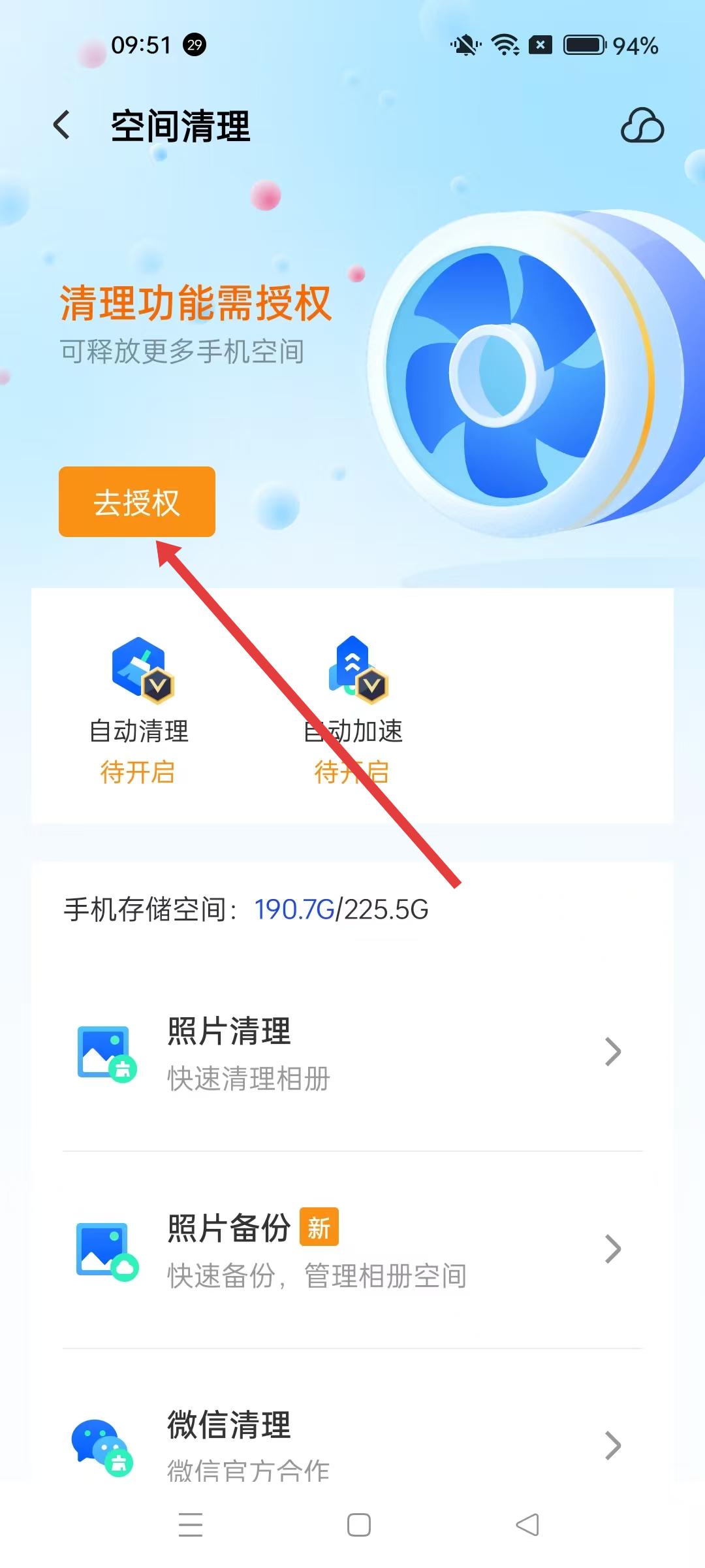 4、空間清理頁面,點擊去授權按鈕,完成清理功能授權,以便釋放更多手機空間。
