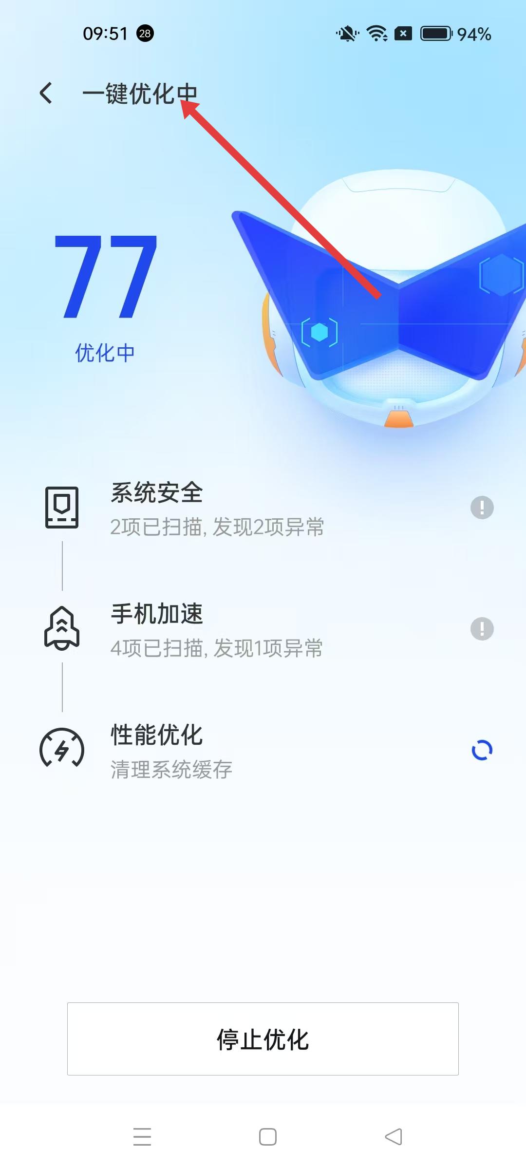 2、進入一鍵優化中頁面,系統會自動掃描系統安全、手機加速等多項內容,進行優化。