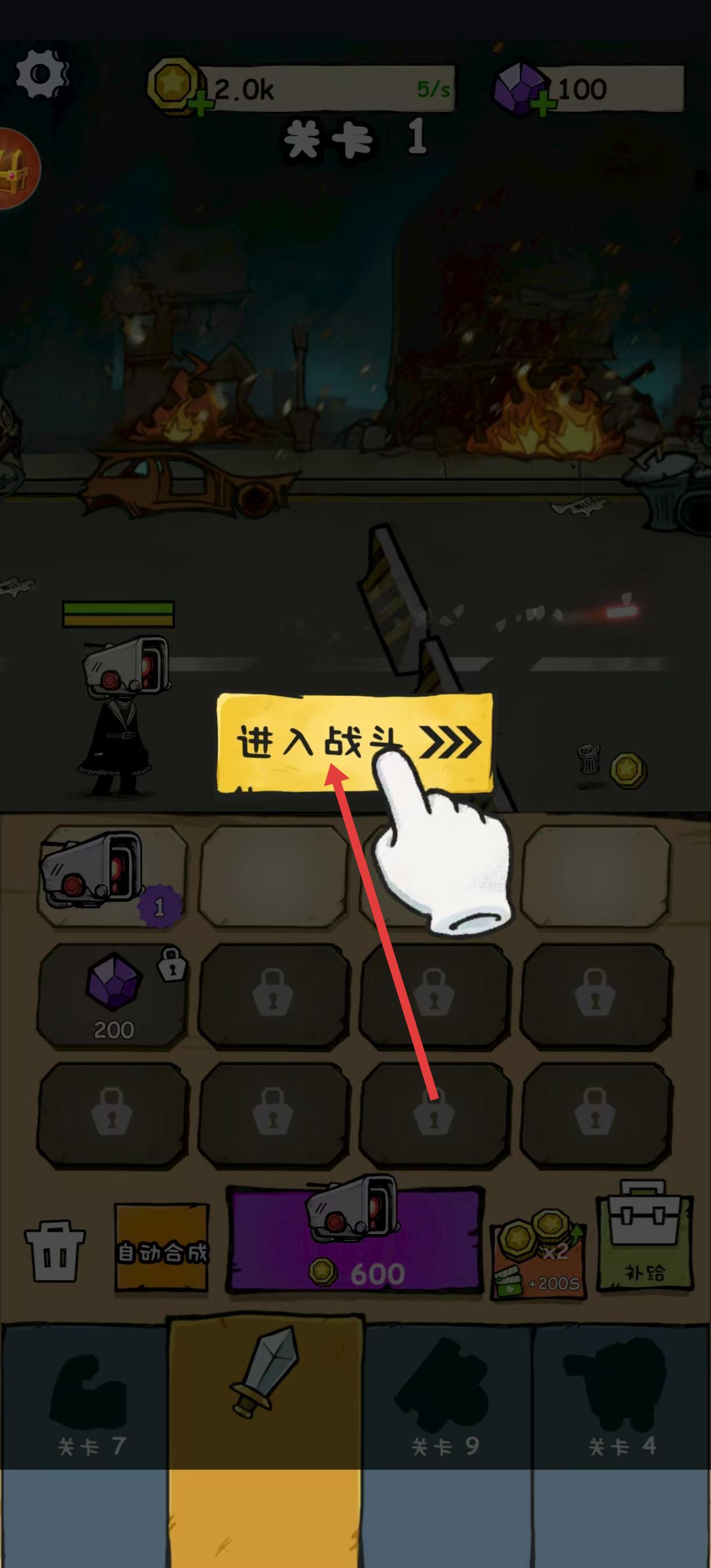 1、進入佳作后,首先看到顯示關卡1的界面,有進入戰斗按鈕,點擊該按鈕,就能進入戰斗場景,開啟關卡挑戰。
