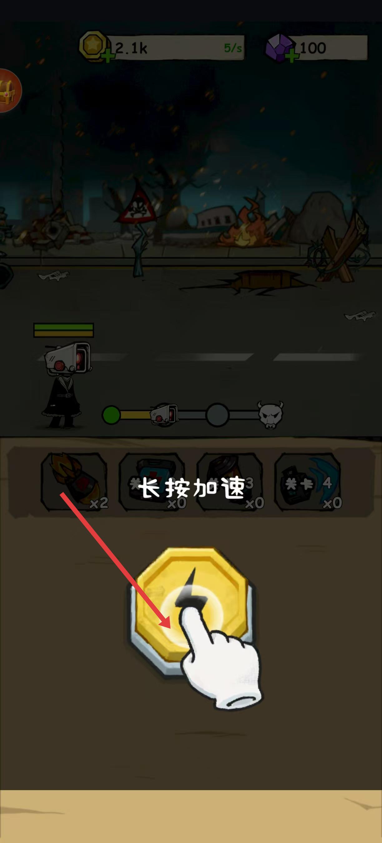2、接著在戰斗場景里看到有長按加速的操作提示,按照提示長按加速按鈕,讓戰斗進程加快,更高效地推進戰斗。