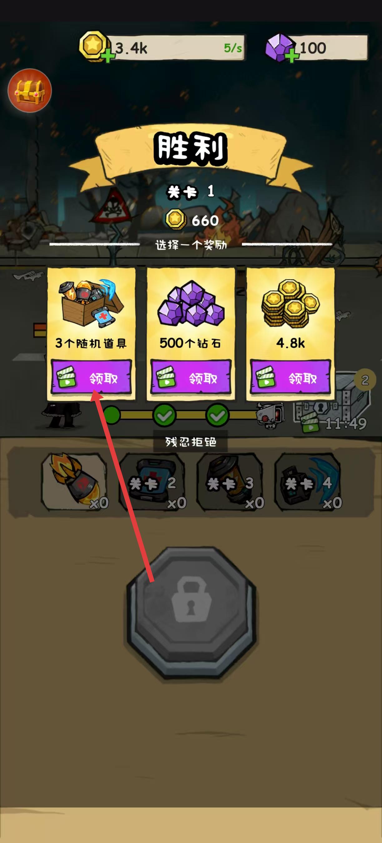 3、然后戰斗勝利后,進入勝利界面,看到有3個隨機道具、500個鉆石、4.8k金幣等獎勵選項,選擇其中一個獎勵,點擊領取,就能獲取對應的獎勵。
