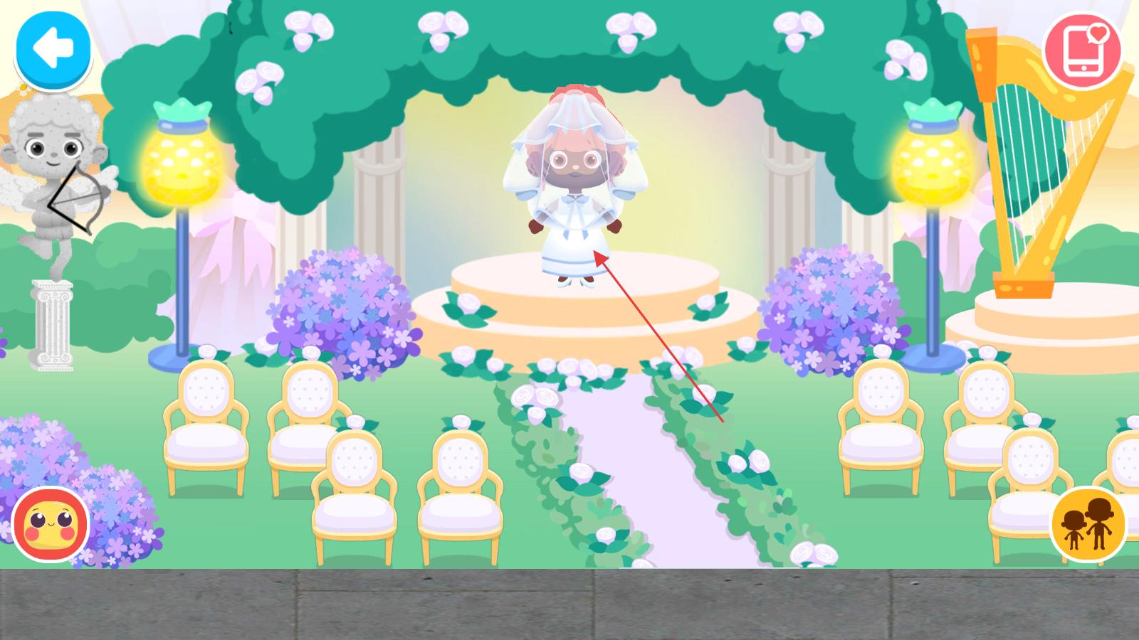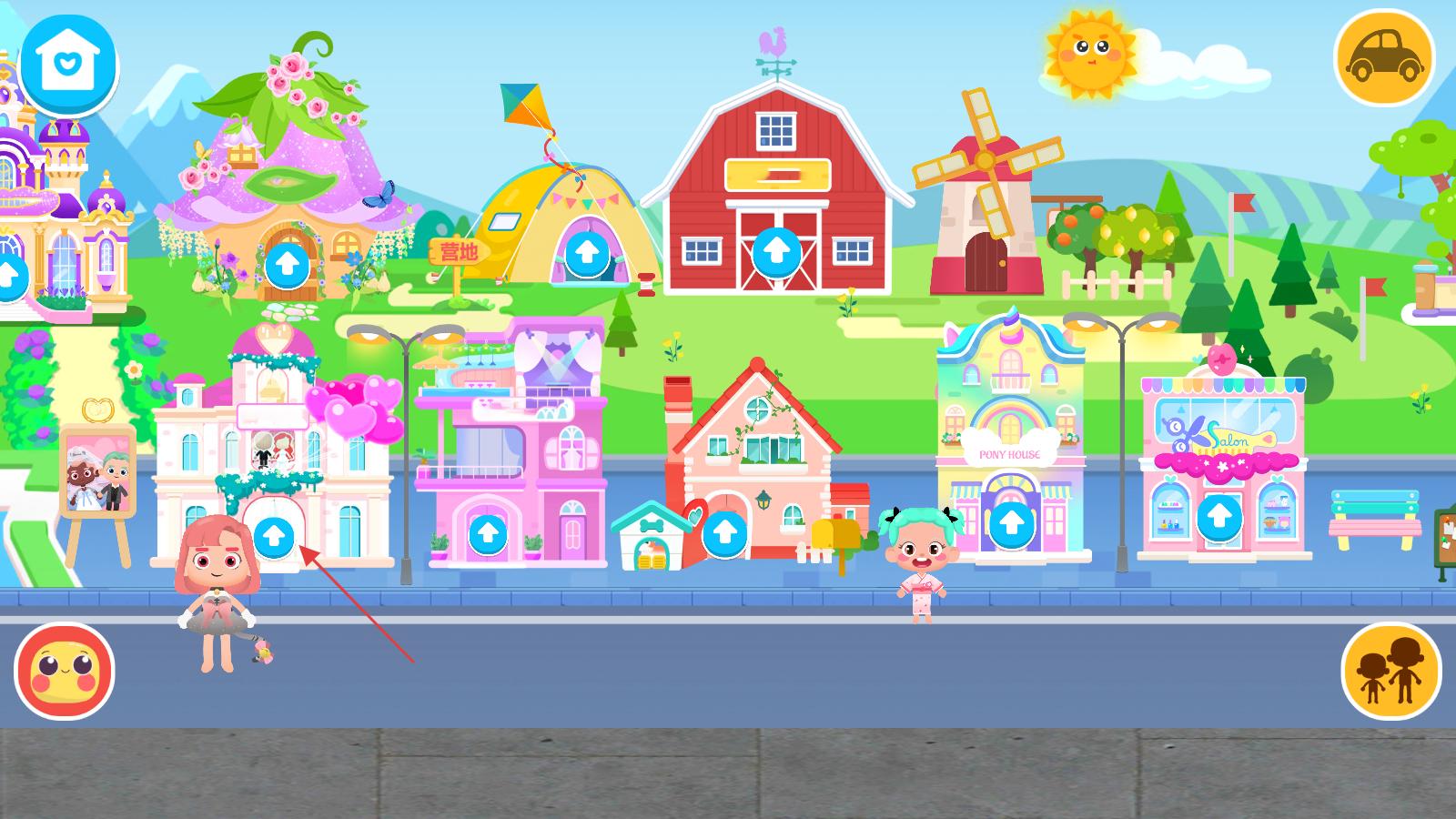 2、在展示各類建筑的場景中找到帶有婚禮元素的粉色建筑,點擊建筑上的藍色箭頭標識,進入該建筑內部場景。