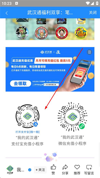 4、下滑頁面可看到武漢通充值優惠的領取入口,選擇打開支付寶或微信掃一掃對應的小程序碼,即可參與充值優惠活動。