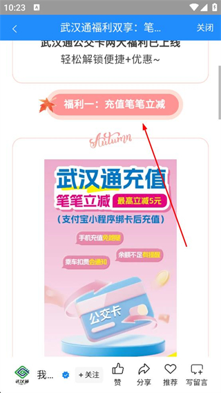 2、在出行資訊列表頁找到武漢通福利雙享筆筆充值立減老年卡綁卡限量領5元線下消的資訊,點擊進入詳情頁。