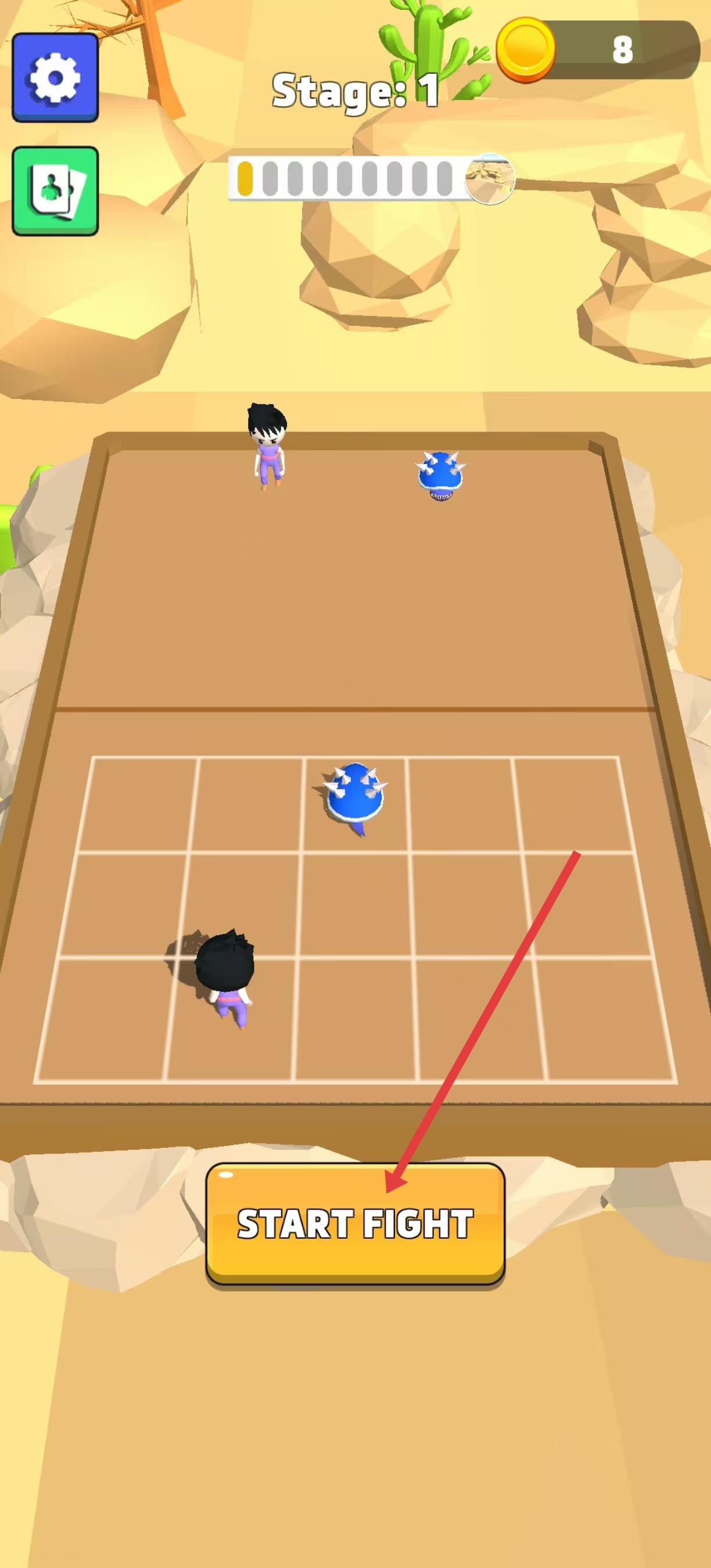 2、接著在格子區域布置好人物后界面下方會出現開始戰斗按鈕,點擊該按鈕,即可開啟與藍色帶刺生物的戰斗。
