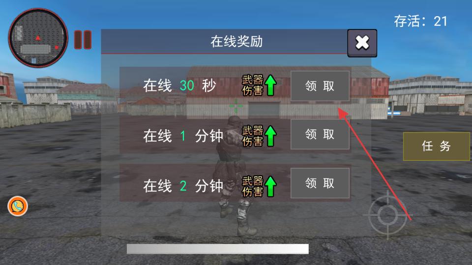 2、在彈出的在線獎勵界面中根據在線時長,領取對應的武器傷害加成獎勵,提升武器的攻擊能力,增強自身戰力。