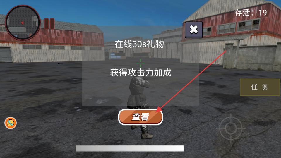 4、當獲得在線30s禮物并提示獲得攻擊力加成時,點擊查看按鈕了解加成的具體情況,然后繼續在戰場中戰斗完成生存任務。