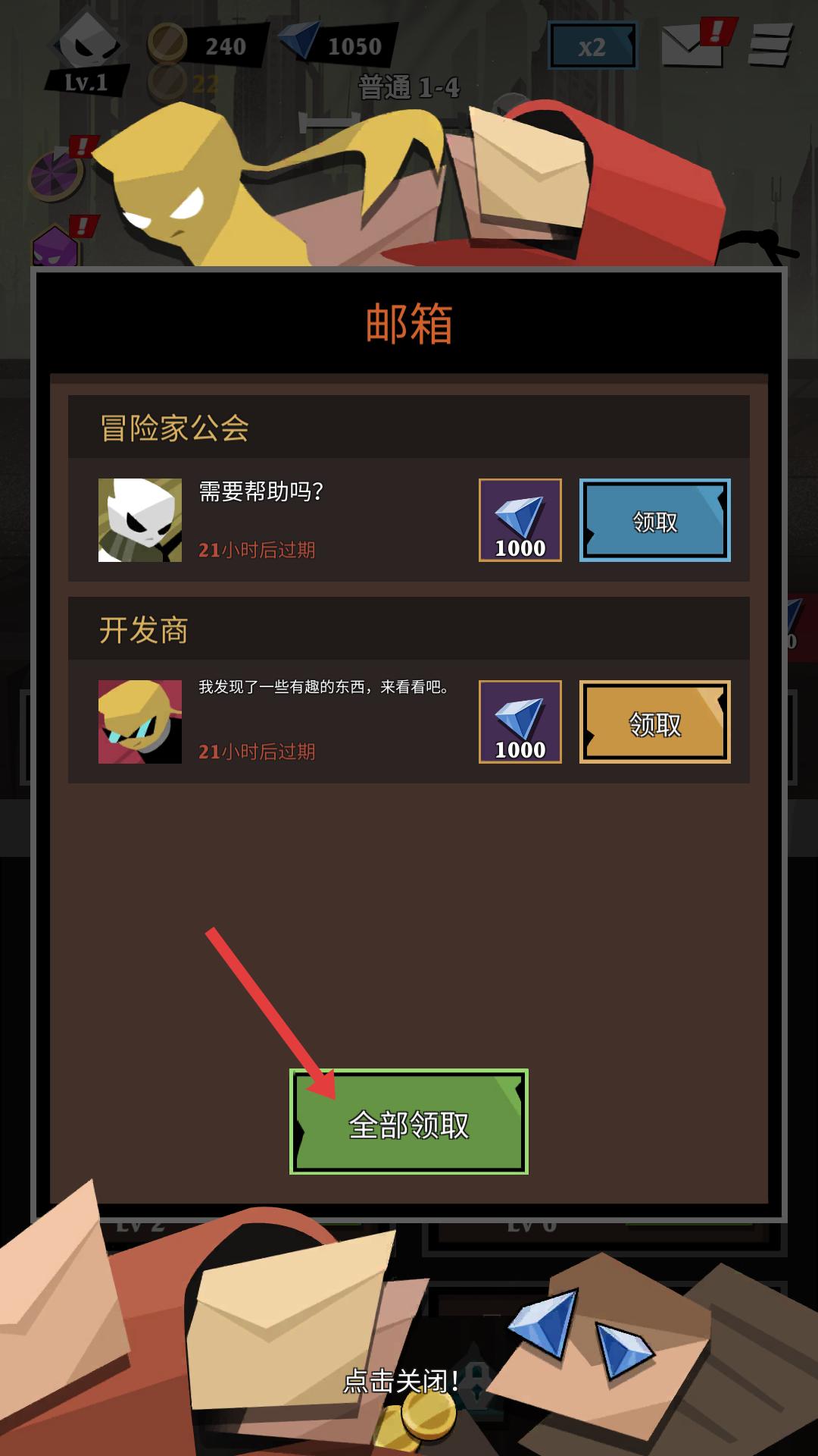 4、游戲中的郵箱會有來自冒險家公會、開發商等的獎勵郵件,點擊全部領取按鈕,可一次性領取所有郵件中的鉆石獎勵,快速積累資源。
