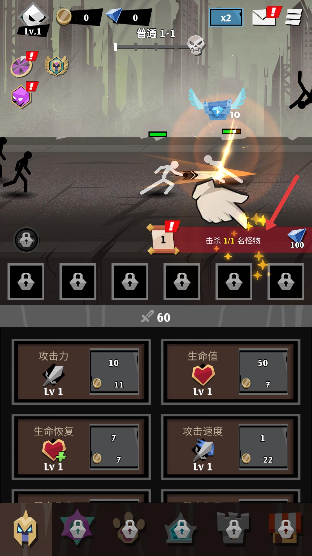 2、進入關卡后,操控火柴人攻擊敵人,成功擊殺怪物,可獲得鉆石等獎勵,同時推進關卡進度,為后續升級等操作積累資源。