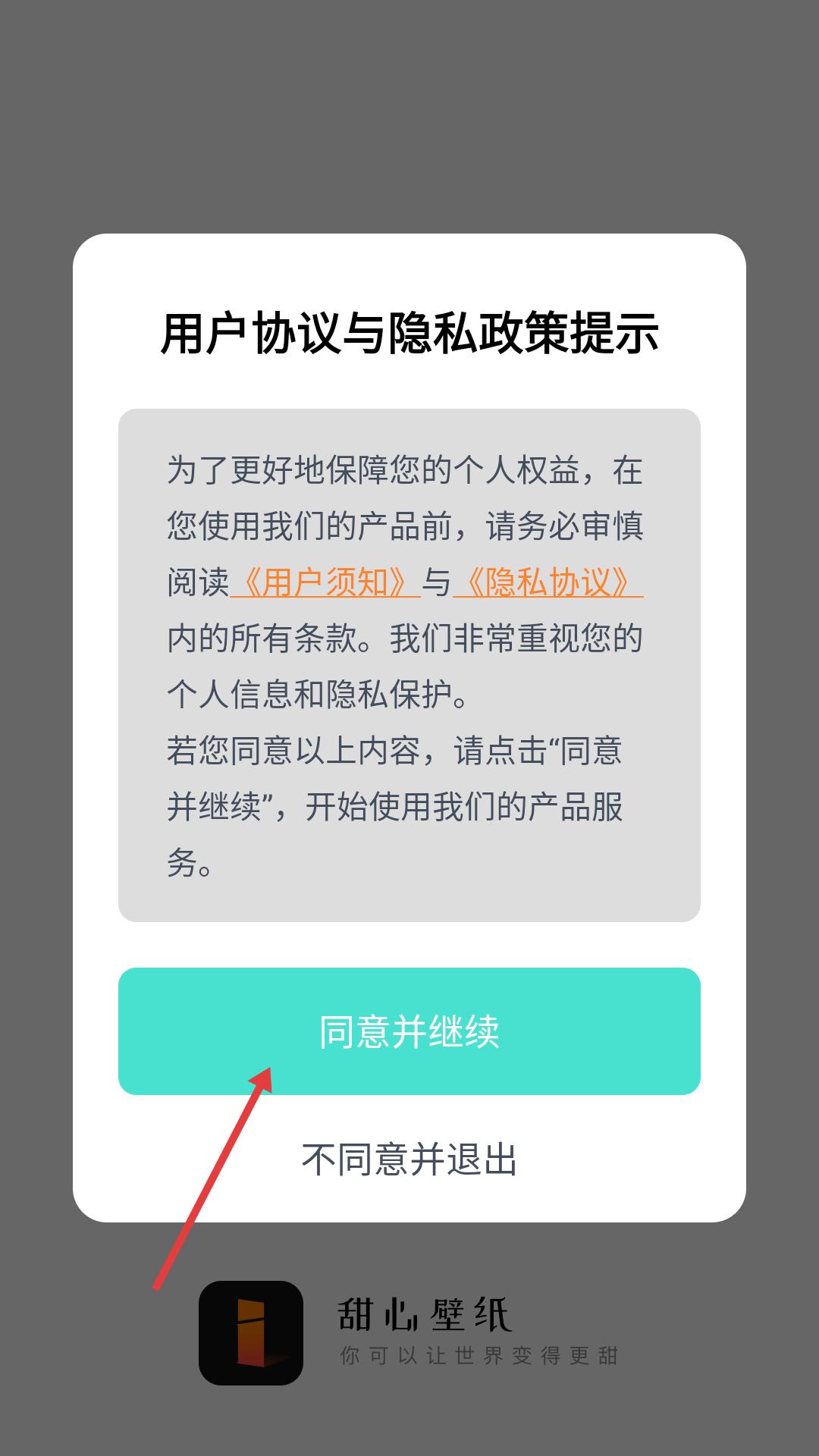 1、打開甜心壁紙,點同意用戶協議,進入首頁,選微信皮膚等功能,瀏覽靜態壁紙,更換手機桌面。